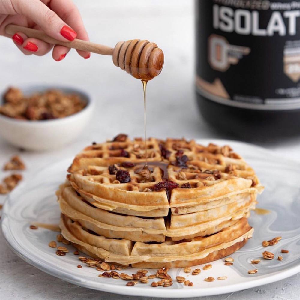 4 claras de huevo, 1/2 taza de avena, 1 scoop de proteina, 1cdta esencia de vainilla y frutos secos como acompañamiento licua todos los ingredientes excepto los frutos secos, pre calienta la wafflera y vierte la mezcla.