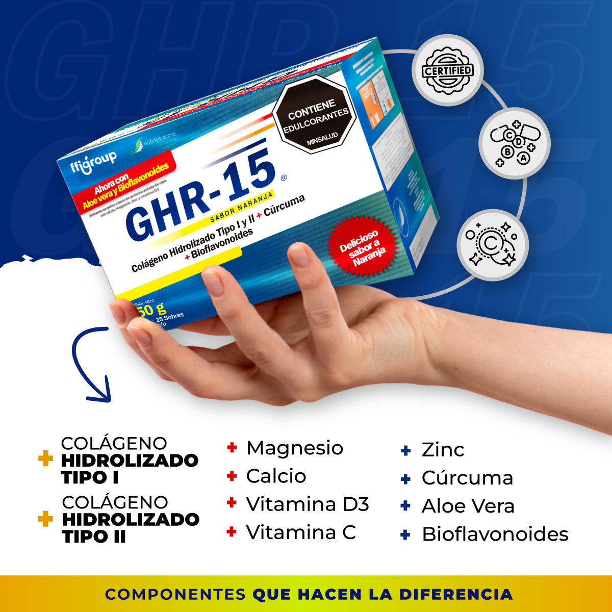 - Fácil de Consumir: Presentado en forma de polvo, GHR 15 es fácil de mezclar con agua, permitiendo una ingesta conveniente y rápida para quienes buscan mejorar su salud articular de manera efectiva.