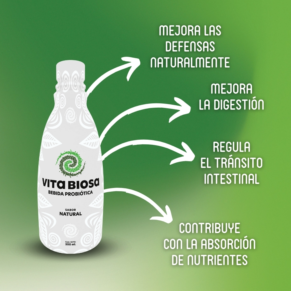 Vita Biosa, sabor Natural, contiene probióticos y prebióticos que contribuyen positivamente a la salud de las personas, mejorando la digestión y subienda las defensas