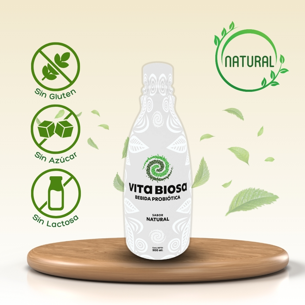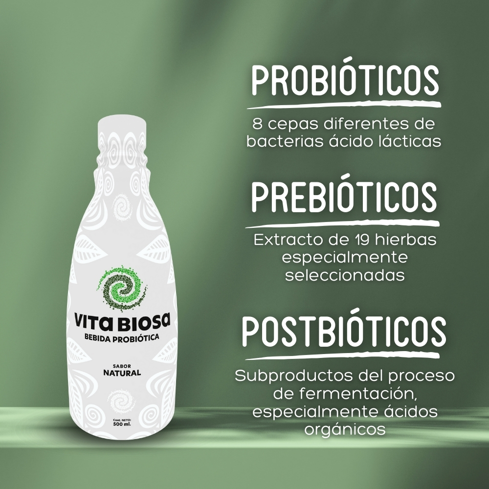 VITA BIOSA Natural, es una bebida fermentada con 8 cepas probióticas, ácidos lácticos y una mezcla prebiótica de 19 hierbas aromáticas. Sin azúcar, gluten y lactosa, elaborado sin preservantes no colorantes 100% Natural.