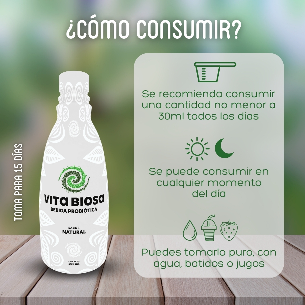 - Cada toma de Vita Biosa sabor Natural, aporta 50 BILLONES de UFC, aumentando y colonizando nuestro Microbioma