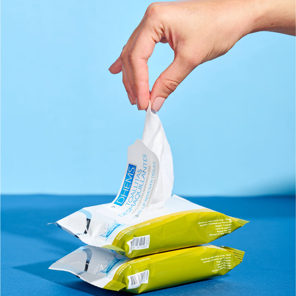 Toallitas desmaquillantes con agentes antioxidantes e hidratantes que remueven impurezas y maquillaje en un solo paso, dejando tu piel limpia, fresca e hidratada. Toallitas desmaquillantes con agentes antioxidantes e hidratantes que remueven impurezas y maquillaje en un solo paso, dejando tu piel limpia, fresca e hidratada. Formato práctico que preserva la humedad y es fácil de llevar. Modo de uso Doblar la toallita en cuatro partes iguales deslizándola por cada sección: rostro, ojos, labios y cuello. Asegúrate de cerrar bien el empaque para conservar la humedad de las toallitas. Continuar con su rutina de cuidado diario.