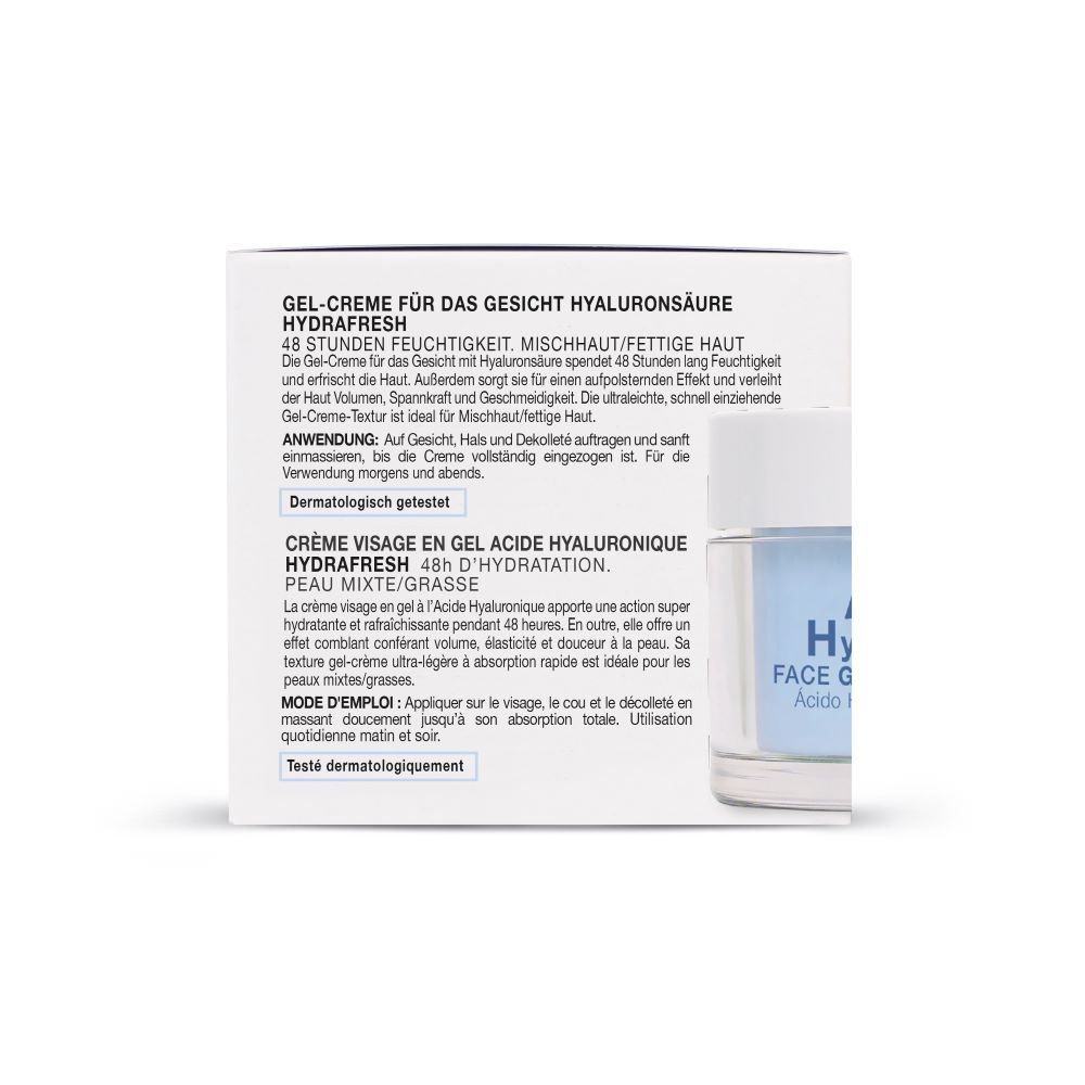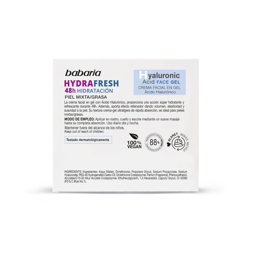 Crema facial en gel Hydrafresh Babaria, con Ácido Hialurónico La crema en gel con Ácido Hialurónico proporciona una acción super hidratante y refrescante durante 48hr. Aporta efecto rellenador, dando volumen, elasticidad y suavidad a la piel. Su textura crema-gel ultraligera de rápida absorción,. Modo de uso Aplicar en rostro, cuello y escote mediante un suave masaje hasta su completa absorción.