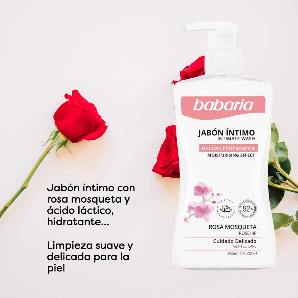 Jabón íntimo Rosa Mosqueta Babaria, con acción hidratante, con Rosa Mosqueta y Ácido Láctico. Limpia suavemente la zona íntima respetando el equilibrio natural de la piel.