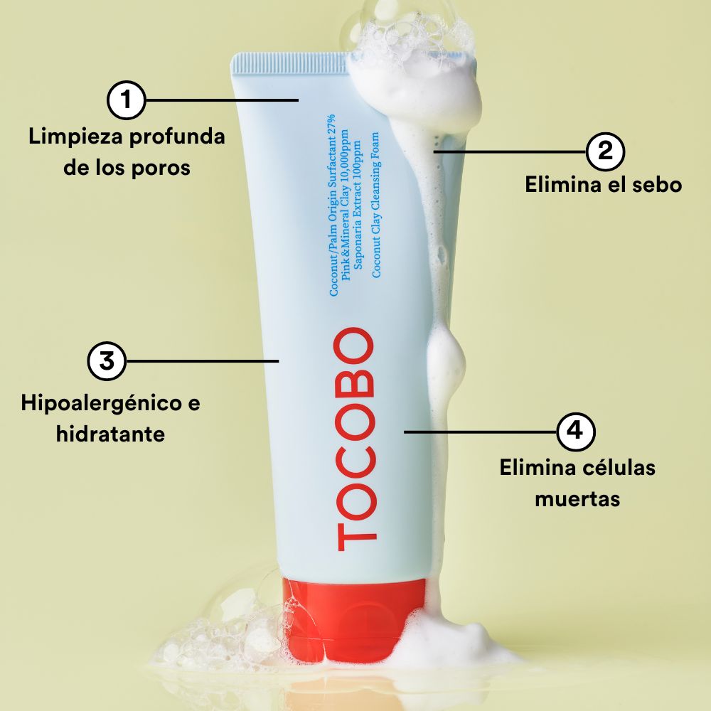 El Coconut Clay Cleansing Foam de Tocobo es un limpiador facial que combina arcilla rosada y extracto de coco para una limpieza profunda. Controla el exceso de grasa, elimina impurezas y deja la piel fresca, equilibrada y suave. Limpiador facial para todo tipo de piel, con arcilla rosada y coco, que limpia los poros a profundidad mientras elimina el exceso de grasa, dejando la piel fresca y suave sin resecar. Ideal para lograr un rostro limpio y sin exceso de sebo Modo de uso 1 Aplicar Toma una cantidad adecuada del producto en tus manos. 2Masajear Agrega agua y haz espuma en tus manos, luego aplícala en tu rostro. 3 Repartir Distribuir la espuma masajeando suavemente el rostro. 4 Enjuaga bien con agua.