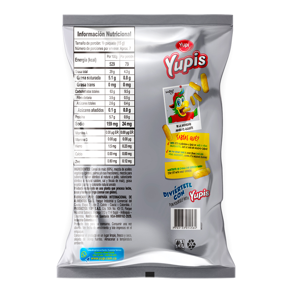 Yupis Salados Sin Sellos 110g Cereal de maíz, mezcla de aceites vegetales girasol, palma yo sus fracciones, mezcla para saborizar sabor idéntico al natural a pollo, saborizante idéntico al natural salobre, sal y fécula de maíz, grasa vegetal palma y colorante natural annato Modo de uso Snack
