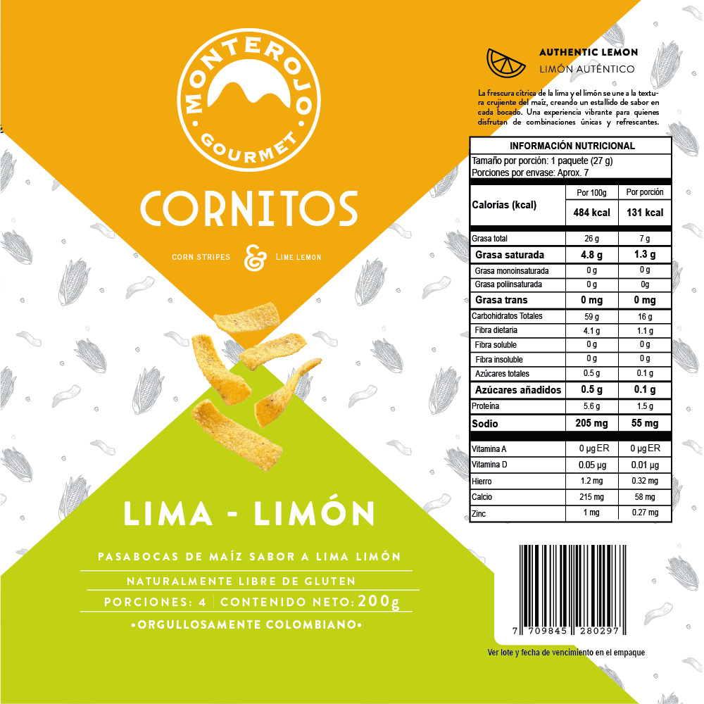 Refresca tu paladar con nuestras crujientes cornitos de maíz Lima Limón, una explosión cítrica que te hará vibrar con cada bocado. Tortilla de maíz crocante en tiritas Modo de uso Versatilidad en la Cocina Perfectos para acompañar ceviches, tacos o darle un giro fresco a tus pasabocas.