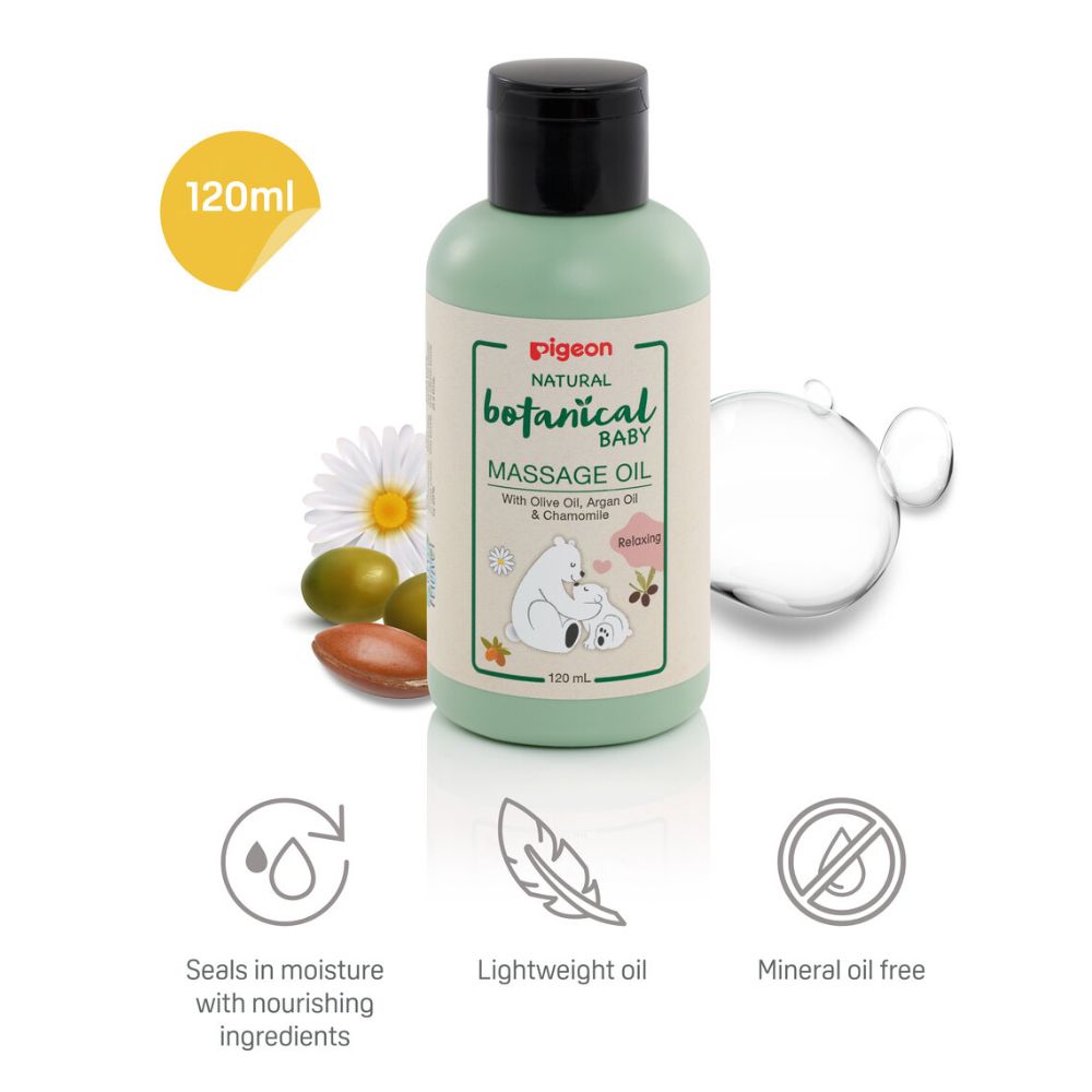 El aceite de masajes para bebés Pigeon, hace parte de la rutina de limpieza e hidratación para la piel de tu bebé y lo prepara para un sueño reparador mientras calma su mente y cuerpo. Esta elaborado con ingredientes naturales nutritivos El aceite de masajes para bebés Pigeon, esta formulado con ingredientes de más del 99 de origen natural, sin aceites minerales y de textura ligera ayudando a sellar la hidratación mientras calma la mente, el cuerpo y la piel para un sueño repar Modo de uso Aplica delicadamente después del baño nocturno, con suaves movimientos sobre la piel del bebé. Ayudar a calma su mente, cuerpo y piel para un sueño reparador