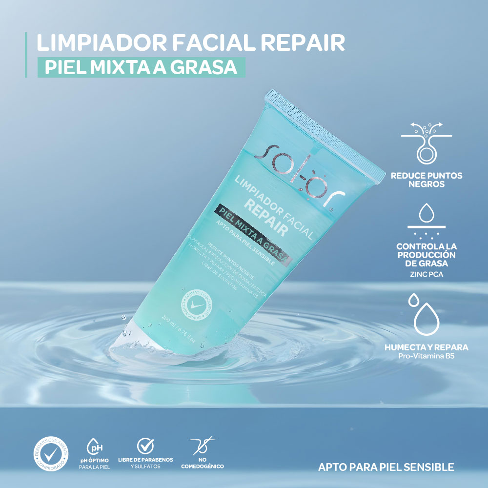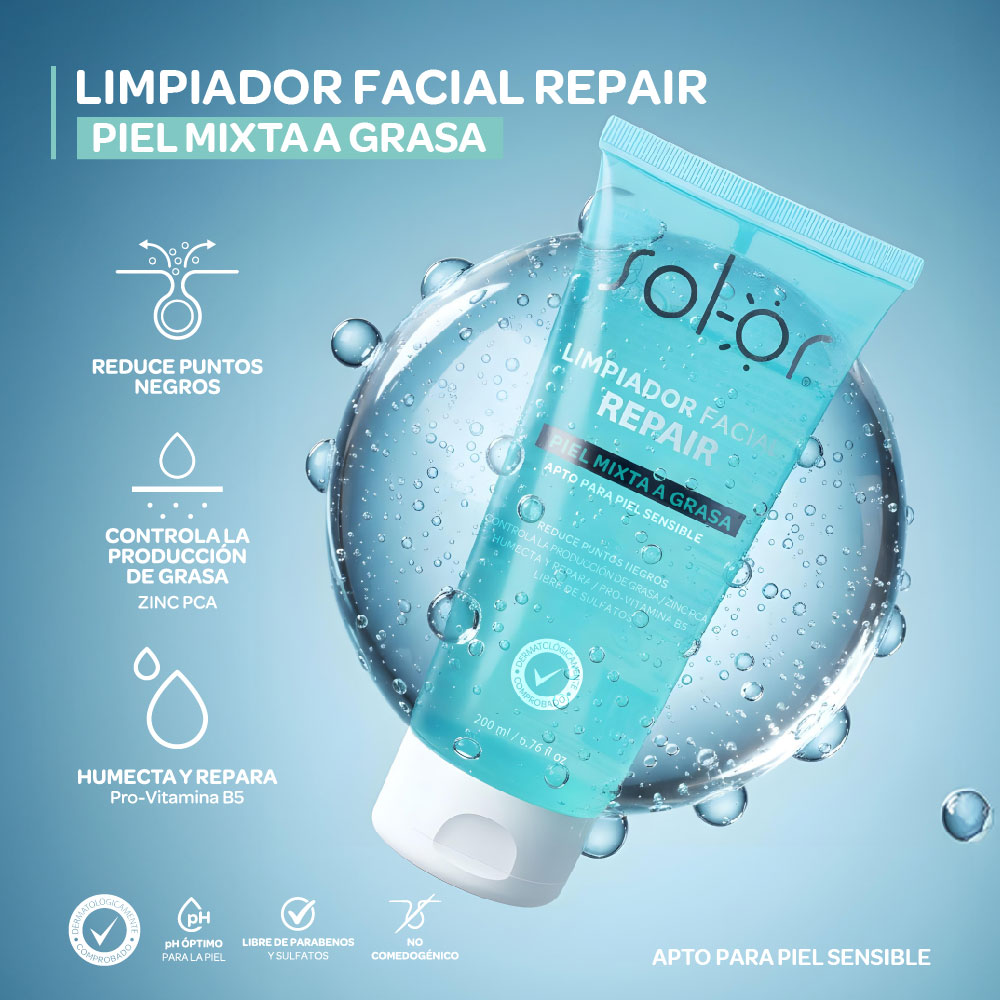 Limpiador Facial Repair x 200 mL para piel mixta a grasa, humecta y repara la piel y reduce puntos negros Solor Limpiador Facial Repair x 200 mL Modo de uso Humedecer el rostro, tomar una cantidad suficiente de Limpiador Facial Repair en la palma de la mano, aplicar haciendo suaves masajes circulares. Enjuagar.