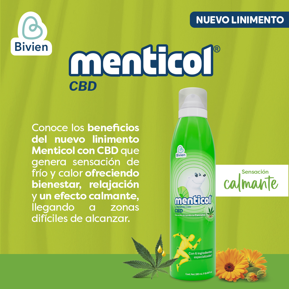 Linimento MENTICOL con CBD x 180 ml. El nuevo Menticol linimento con CBD contiene una mezcla sinérgica de Mentol, Salicilato de Metilo y CBD, con sensación de frio y calor y que ofrece bienestar, relajación y un efecto calmante llegando a zonas difíciles de alcanzar.